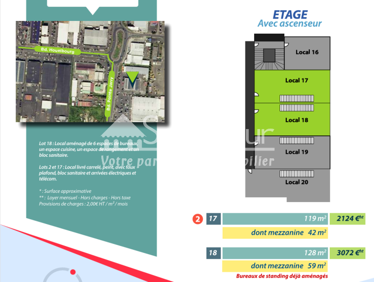 - Emplacement stratégique au cœur de Jarry / Accessibilité optimale grâce à l’ascenseur et aux escaliers / Espaces modernes et modulables, adaptés à divers usages professionnels / Environnement dynamique et attractif.